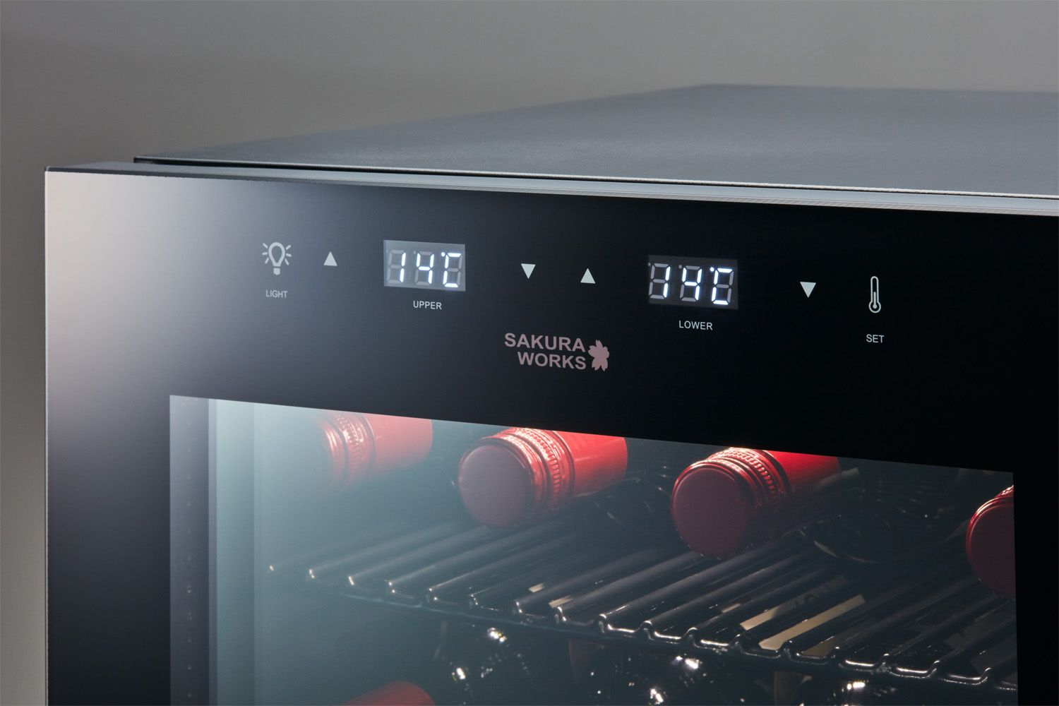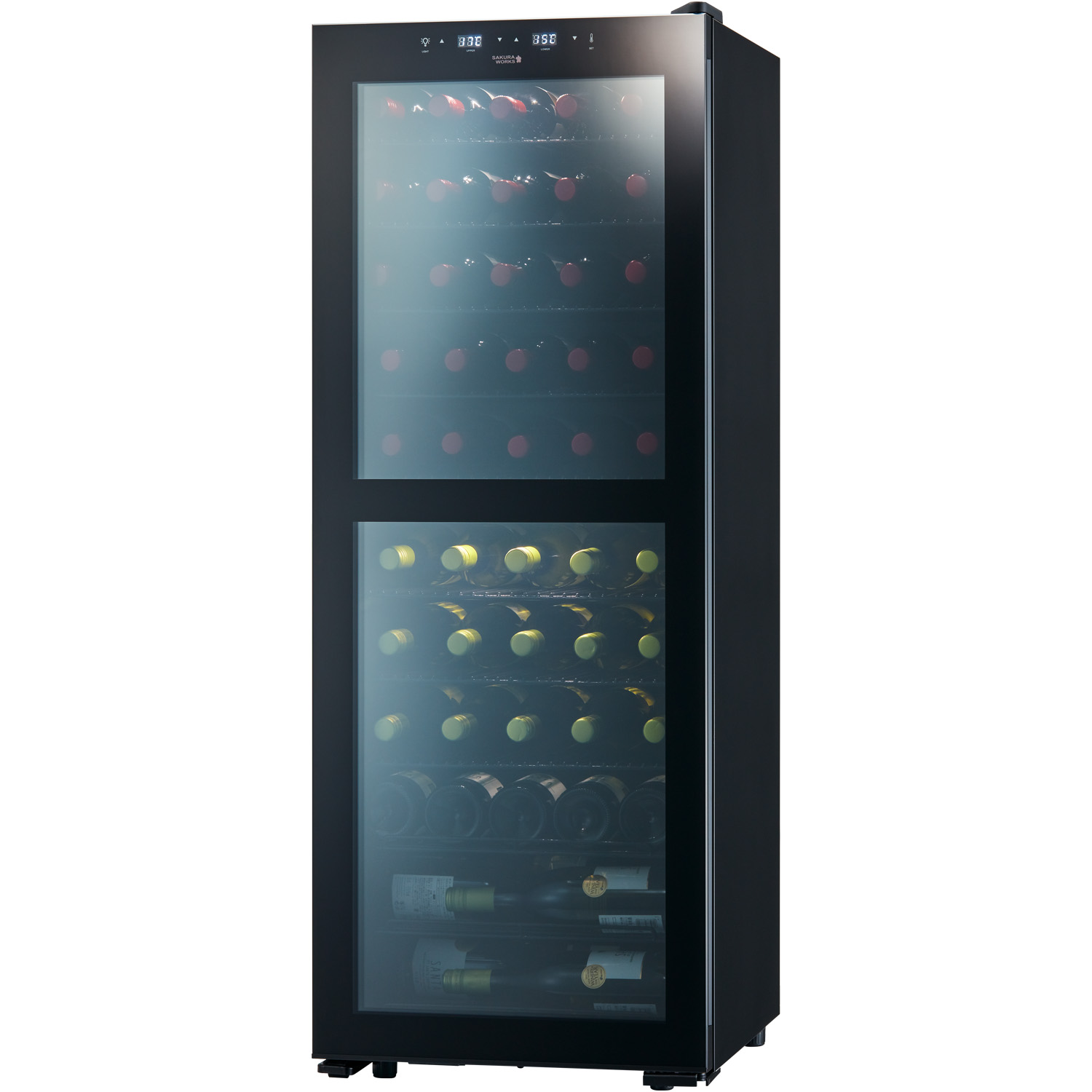 Smart SB51には、一般的なワインのフルボトルが51本収納できます。上室と下室、別々に温度管理が可能な使いやすいモデルです。最小クラスの設置面積に、独自の内箱で大容量化を実現。ボトルどうしが近い距離で収納されるので、液体の比熱特性が生かされ、満タンにしたときほど省エネ効果を発揮すしやすい特徴をもっています。