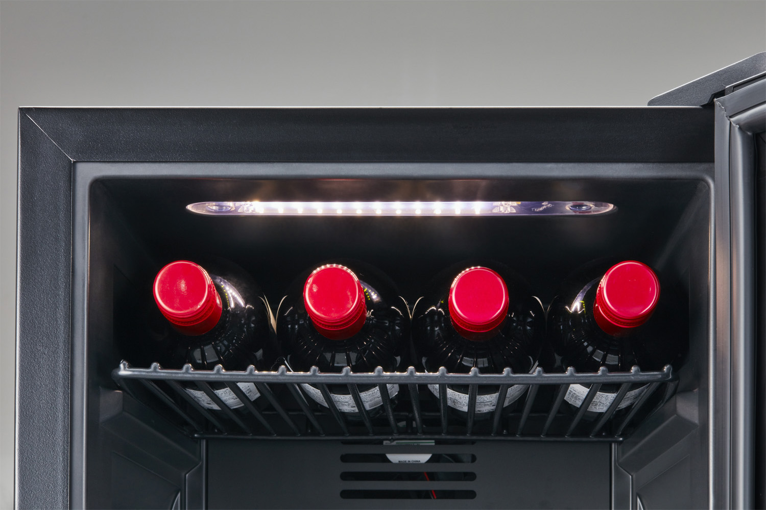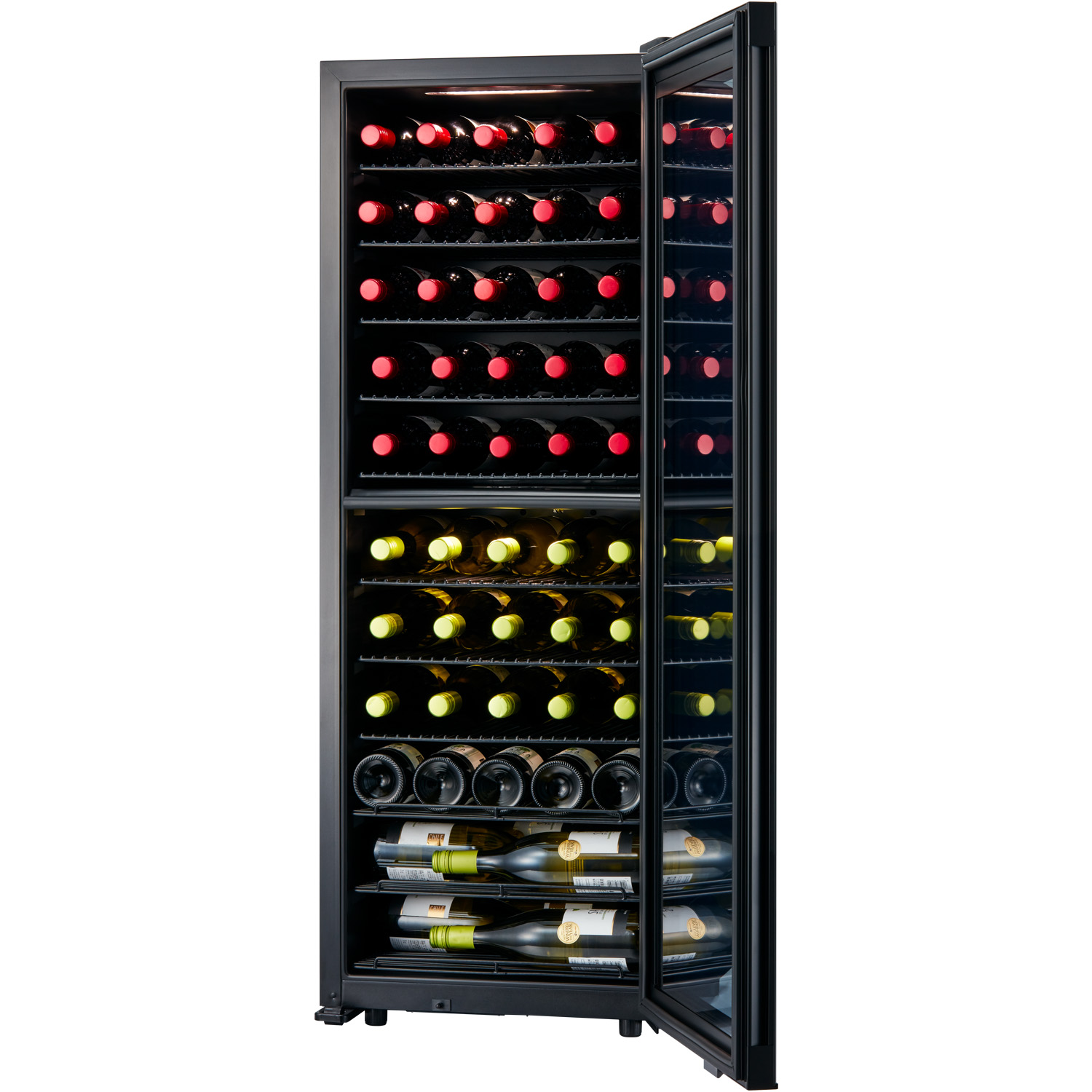 ボトルの直径が96mm程度ある太めのスパークリングワインなどのボトルでも、スムーズに収納できる設計になっています。下段にも、高さが300mmまでの一般的なボルドーやブルゴーニュボトルが横置きで収納できます。