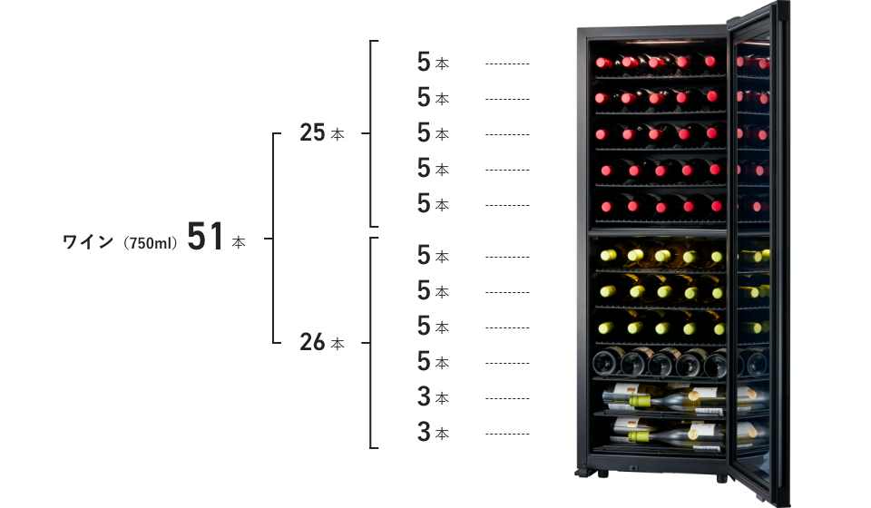 | 収納本数(ワイン) | 51本(上室25本 下室26本) | |