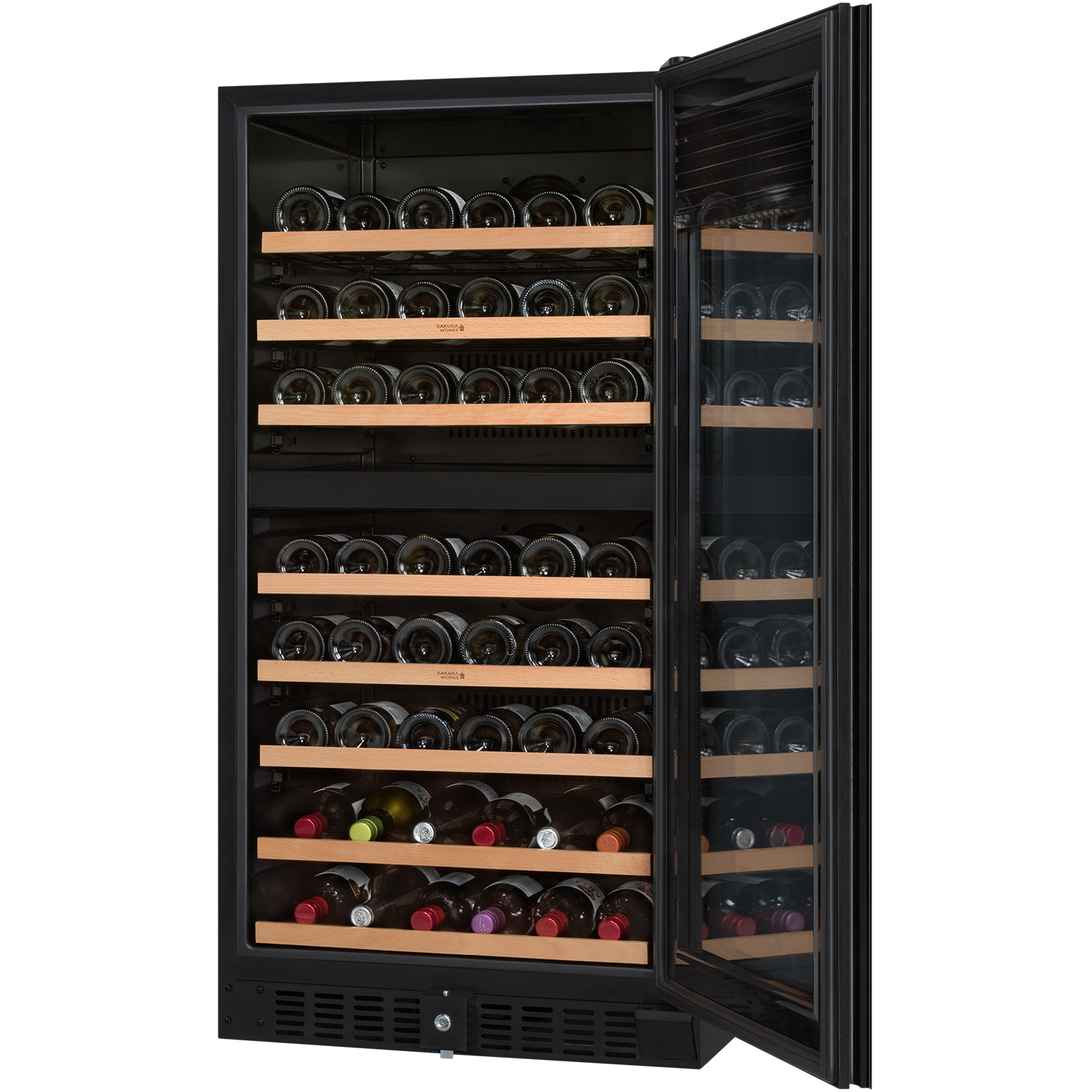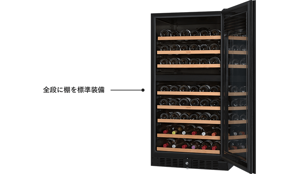 ワインを積み重ねる保管方法では、ワインが取り出せないうえに厳格な温度管理も難しくなります。このような大容量セラーが主流の中、SVシリーズではすべての段に棚を標準装備していることも特長です。スムーズに引き出せるスライド棚で、すべてのワインを容易に保管できる使いやすさが備わっていないと、たくさんのワインを保管することがむしろストレスになってしまいます。棚を増やすことで収納本数が減る心配もない良心的なセラーです。