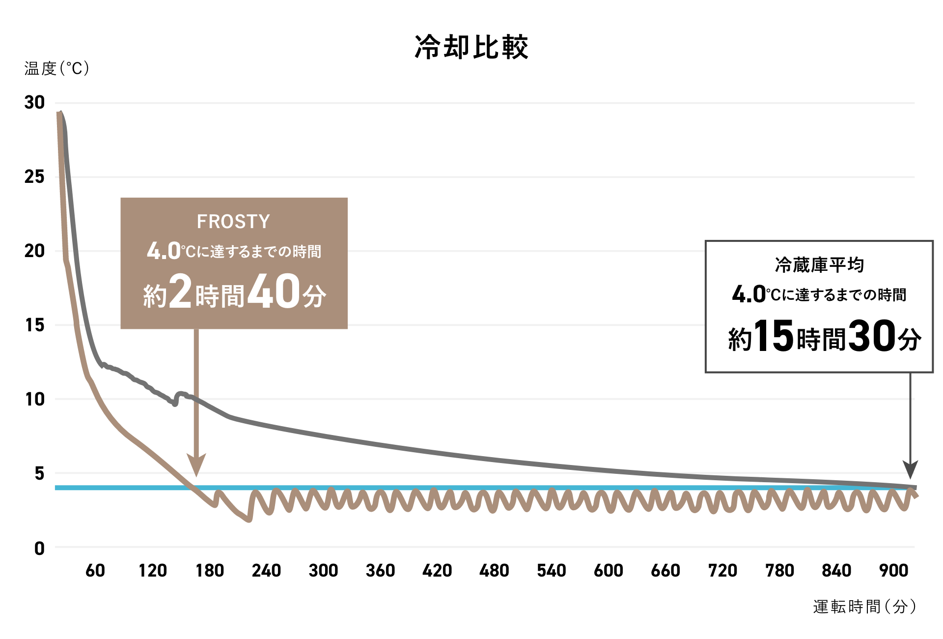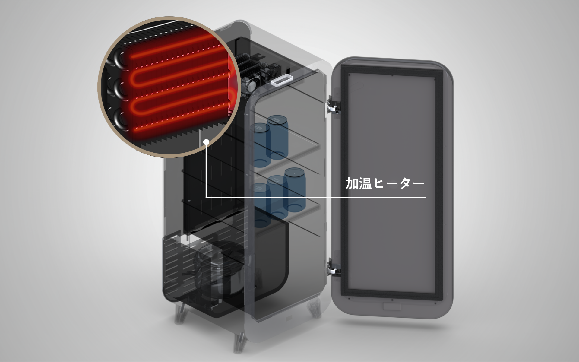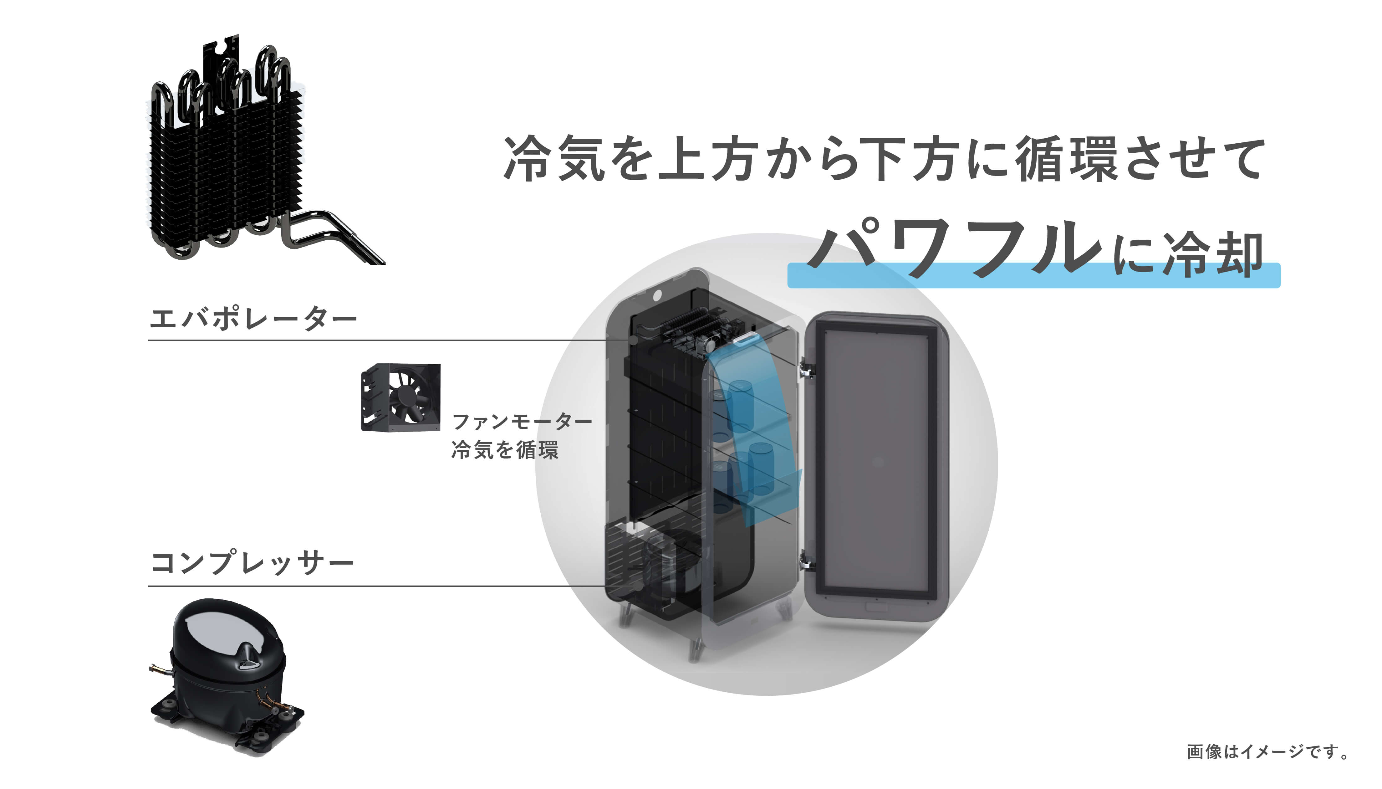 大型冷蔵庫と同等の高性能な冷却サイクルを採用。アルミフィンチューブタイプの冷却器(エバポレーター)を搭載して、2つのファンモーターで冷気を循環させます。セラーメーカーならではの冷却技術を活用することで、一般的な小型冷蔵庫と比べて冷やし始め(プルダウン)冷却時間が約9.5時間も短縮。より短時間で、よく冷えたドリンクを楽しむことができます。また、高性能ヒーターによる自動霜取機能が搭載されているので、冷却器に付いた霜を手動で取り除く手間も不要です。