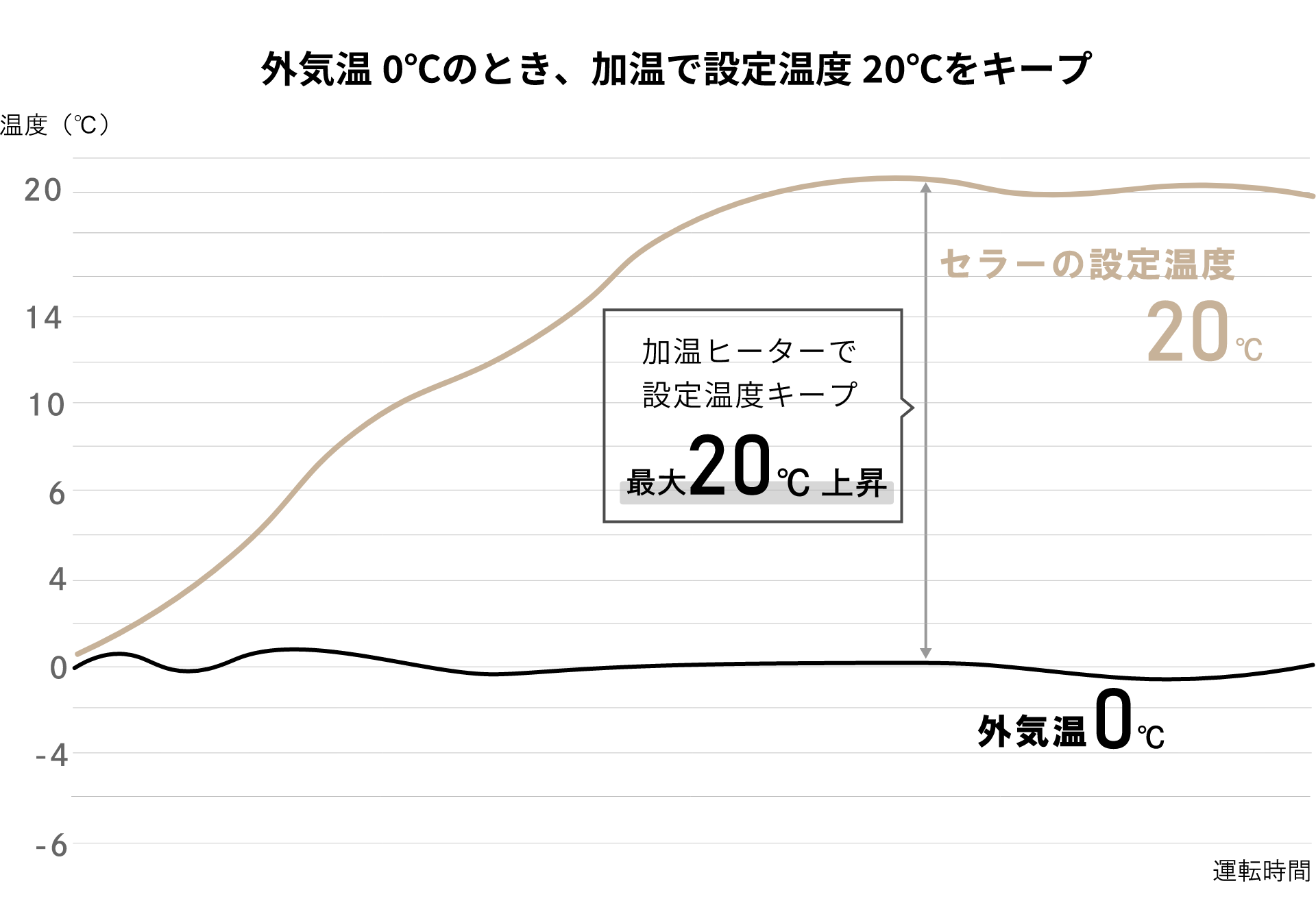 下限値-5℃〜上限値20℃までを6段階に分け、温度管理できる機能を搭載しています。「セラーモード」や「パントリーモード」では、冷蔵庫よりも高い温度設定ができるので、ワインセラーとしても活用できます。また、上限20度まで調節可能な「加温ヒーター」を搭載。冷蔵庫内の温度より外気温が低い場合でも、冷蔵庫内の温度を適温に保つことができます。外の気温が低くなりがちな寒冷地でも、安心してご利用いただけます。