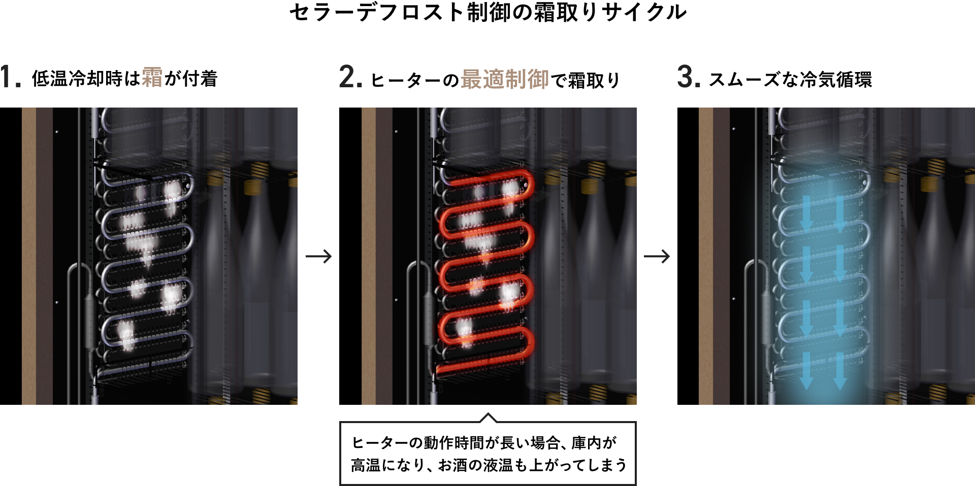 日本酒の保管の為に開発された制御技術です。一般的な冷蔵庫などでお酒を貯蔵する場合、空気の急激な温度変化が品質劣化のリスクになりえます。冷却運転に発生する霜を画一的にヒーターで溶かすことで、ヒーターの熱により庫内が一気に温まってしまうためです。セラーデフロストコントロールは、冷却配管の温度によって霜取運転が変わる制御。霜取り時にヒーターの動作時間を最適化するので、お酒の液体温度変化を最小限に抑えることができ、品質の劣化リスクを低減します。