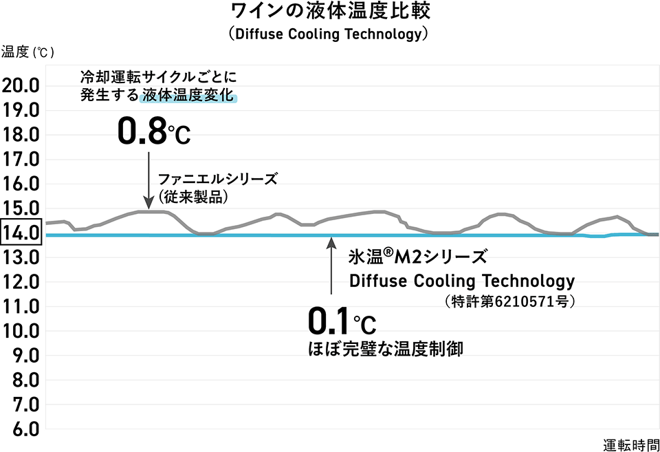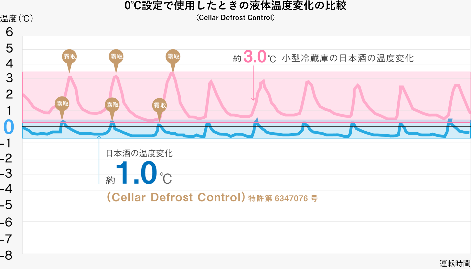 0℃以下の氷温®で冷やした液体温度のブレも最小限に抑えるので、日本酒セラーとしても高い性能を発揮します。小型冷蔵庫と比較しても0℃をキープするだけでなく霜取り時の液体温度を安定させ日本酒をできる限り長期間保存することができるようコントロールします。