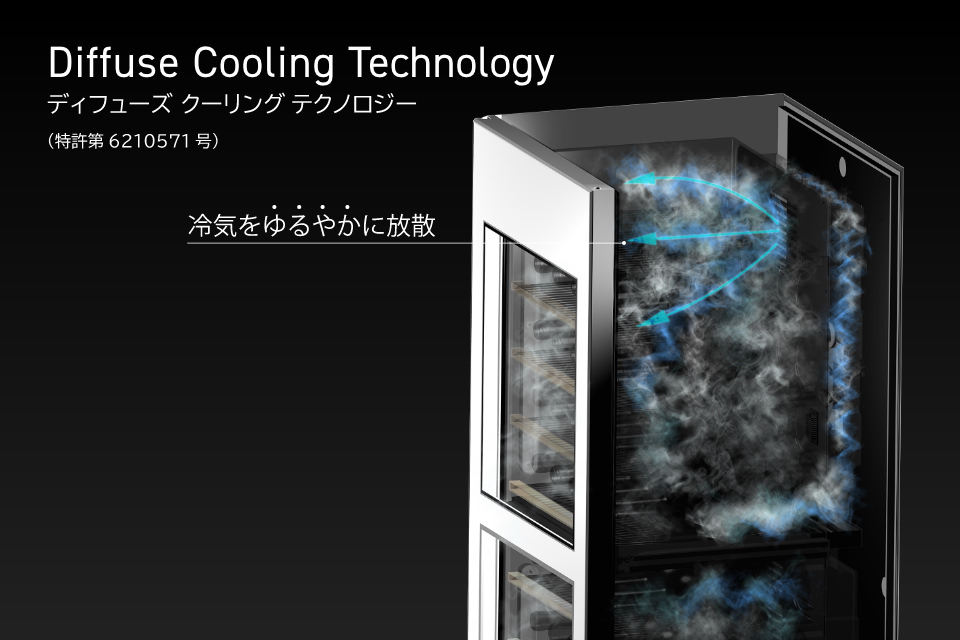 これまでのワインの温度管理に最適な特許技術、「バンクショットクーリングテクノロジー」の課題は冷気の移動距離が長くなる分風速が落ちてしまうことです。そのため、製品サイズの大型化には限界がありました。新しく開発した制御は「ディフューズショットクーリングテクノロジー」です。ファンモーターから発出する冷気の流れに着目して、冷気もっと分散させるアイディアで冷たい冷気を遠くに届かせることができるようになりました。これによって、静音性と省エネ性を両立させて大型化することが出来ました。
