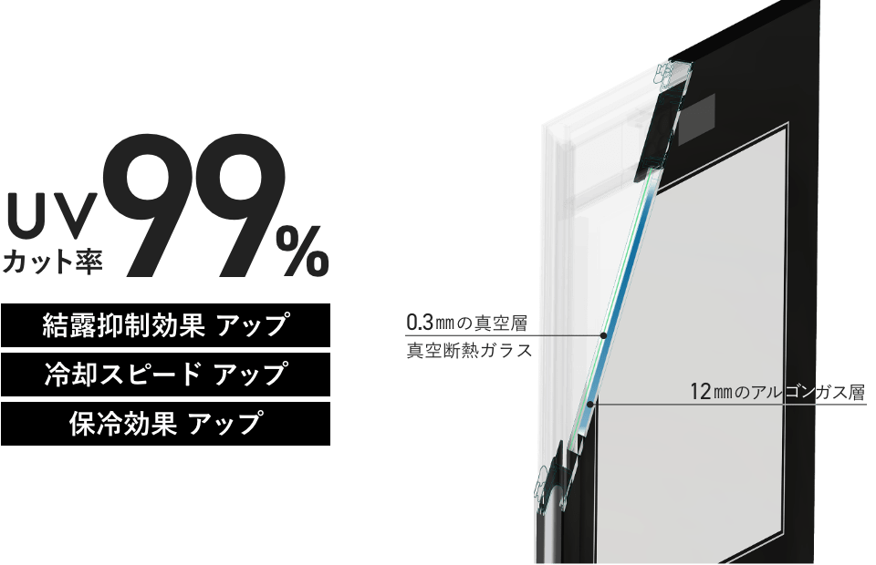 高性能なダブルLow-eガラスよりもさらに断熱性能の高い真空断熱ガラスを搭載しました。ダブルLow-eガラスよりも10%以上も省エネ効果を発揮し、ほぼ100%近くまで紫外線の侵入を防ぎます。さらに、高い断熱性によってガラス表面への結露リスクも大幅に軽減できるようになりました。