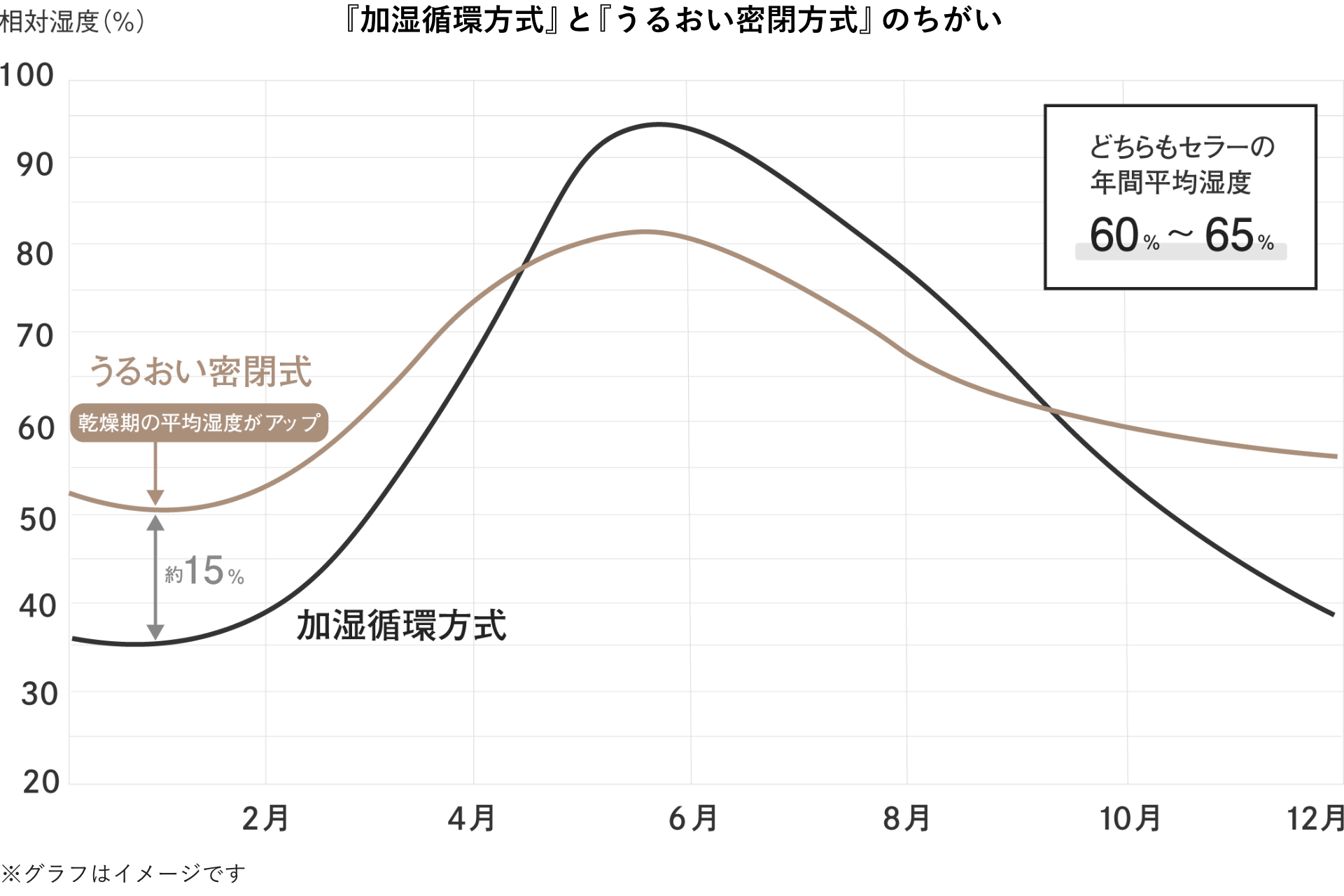 これまでの長期熟成用の湿度維持システム「加湿循環方式」をさらに見直した全く新しい湿度維持性能を搭載しています。外気を取り込まずにうるおいを密閉する発想と冷凍サイクルの運転時間などの制御によりワインの長期熟成に必要な湿度を保つ機能です。