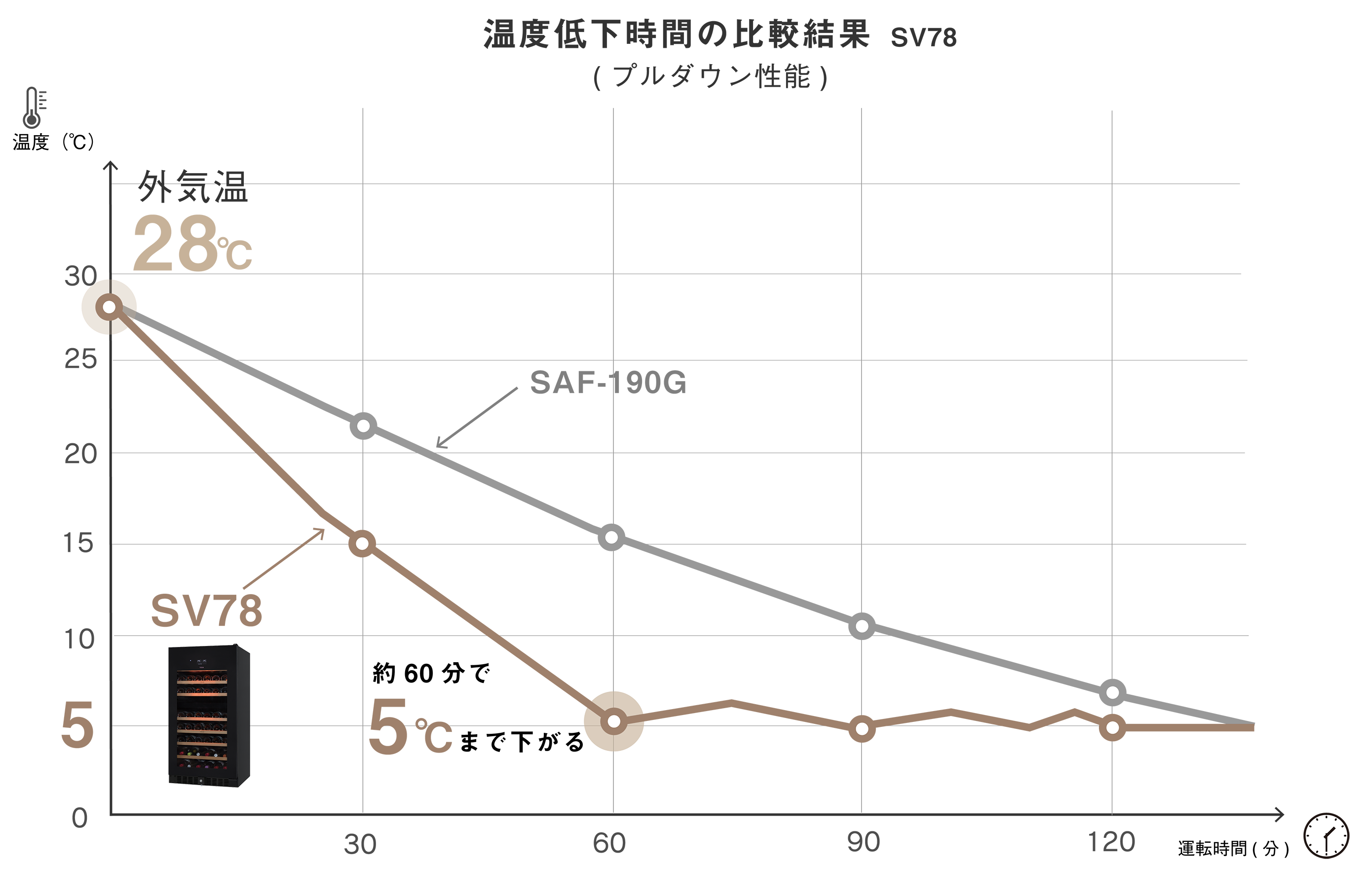 プロユースに耐える強力な冷却能力を持っています。SAF-190Gと比べて半分の時間で設定5℃までプルダウンするので、頻繁なドアの開閉があっても、素早く設定温度に復帰します。大容量だから、頻繁なワインの出し入れを想定したプロの用途に最適なセラーです。