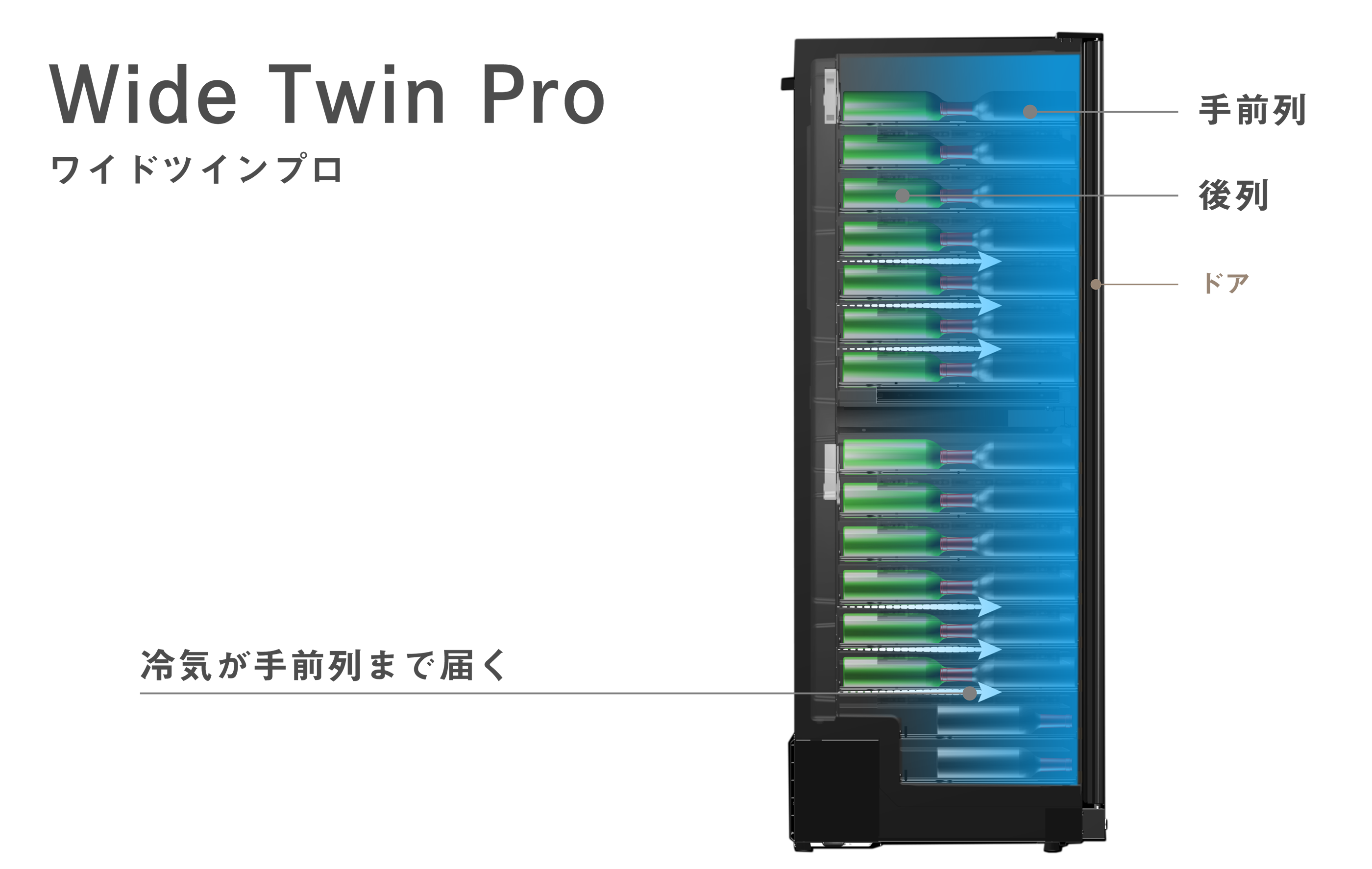 前後にワインを並べて保管するセラーは庫内を均一に冷却しにくく、ワインの長期熟成ができる厳格な温度環境を作ることは困難です。PRO CLASSはボトルの間をすり抜けて手前列までしっかり冷気を届かせる機構を搭載し、飲食店の期待に応える高い冷却性能と長期熟成環境を提供します。