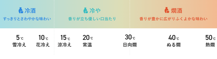 「冷酒(れいしゅ)」や「熱燗(あつかん)」とは、日本酒を飲む時の温度から名付けられた古くからある呼び名です。日本酒は、冷やしても温めても美味しく飲める温度範囲が広いお酒なんです。まずは、温度によってどんな楽しみ方ができるのかを知っておくとよいでしょう。