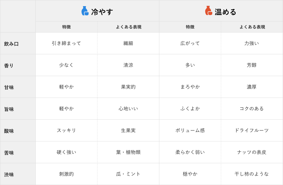 まずは、温度によって何が変わるのかを知っておくとよいでしょう。日本酒は冷やすと香りが爽やかになり引き締まる一方で、苦みを感じやすく、甘みや旨味も感じにくくなると言われます。