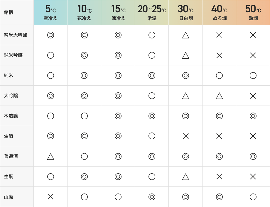 日本酒の魅力は、色々な温度で楽しむことができる点です。実は日本酒には熱燗や冷酒以外にも、雪冷えや上燗など、温度によってさまざまな名称が付けられています。同じ銘柄でも、飲む温度が変われば風味や香りも趣が変わってくるので、自分好みのお酒を見つけたら温度による変化を加えてみると、味わいのバリエーションが増えていきます。
