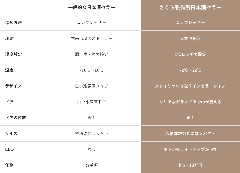 しかし、日本酒専用のセラーはまだまだ珍しい存在で、ワインセラーのように機能や見た目が洗練されているものは少数です。その認知度の低さや限られた用途から、飲食店でも日本酒専用セラーを用意するのではなく、ワインセラーや冷蔵ショーケースを日本酒の管理にも使っている場合が多いでしょう。
