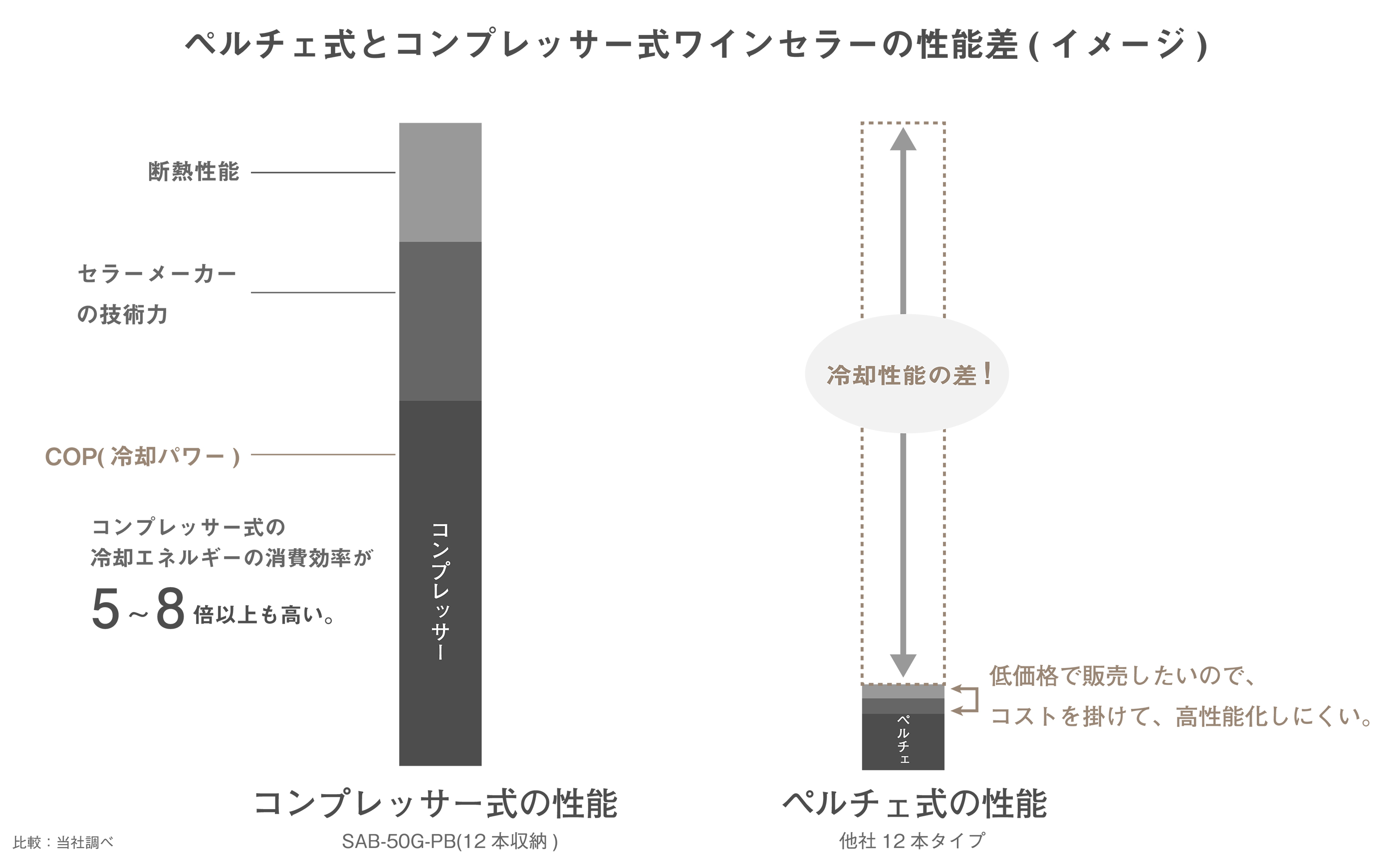 まず、電気代の差は、COP(Coefficient Of Performance)という「冷却のエネルギー消費効率」を示す成績係数の差に寄与します。ここでは分かりやすく「冷却パワー」と言い換えます。ワインセラーに使われているペルチェの冷却パワーが「0.2」くらい。一方、コンプレッサーは「1.0~1.6」程度。5倍~8倍以上もコンプレッサーが高性能です。