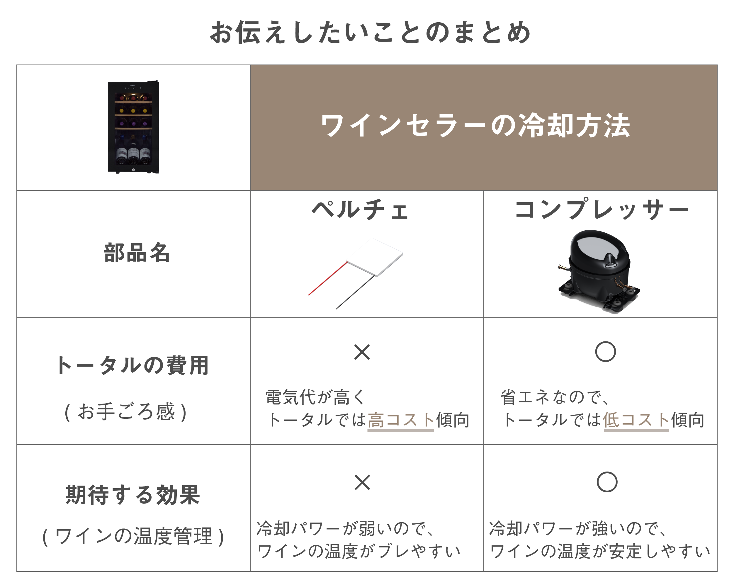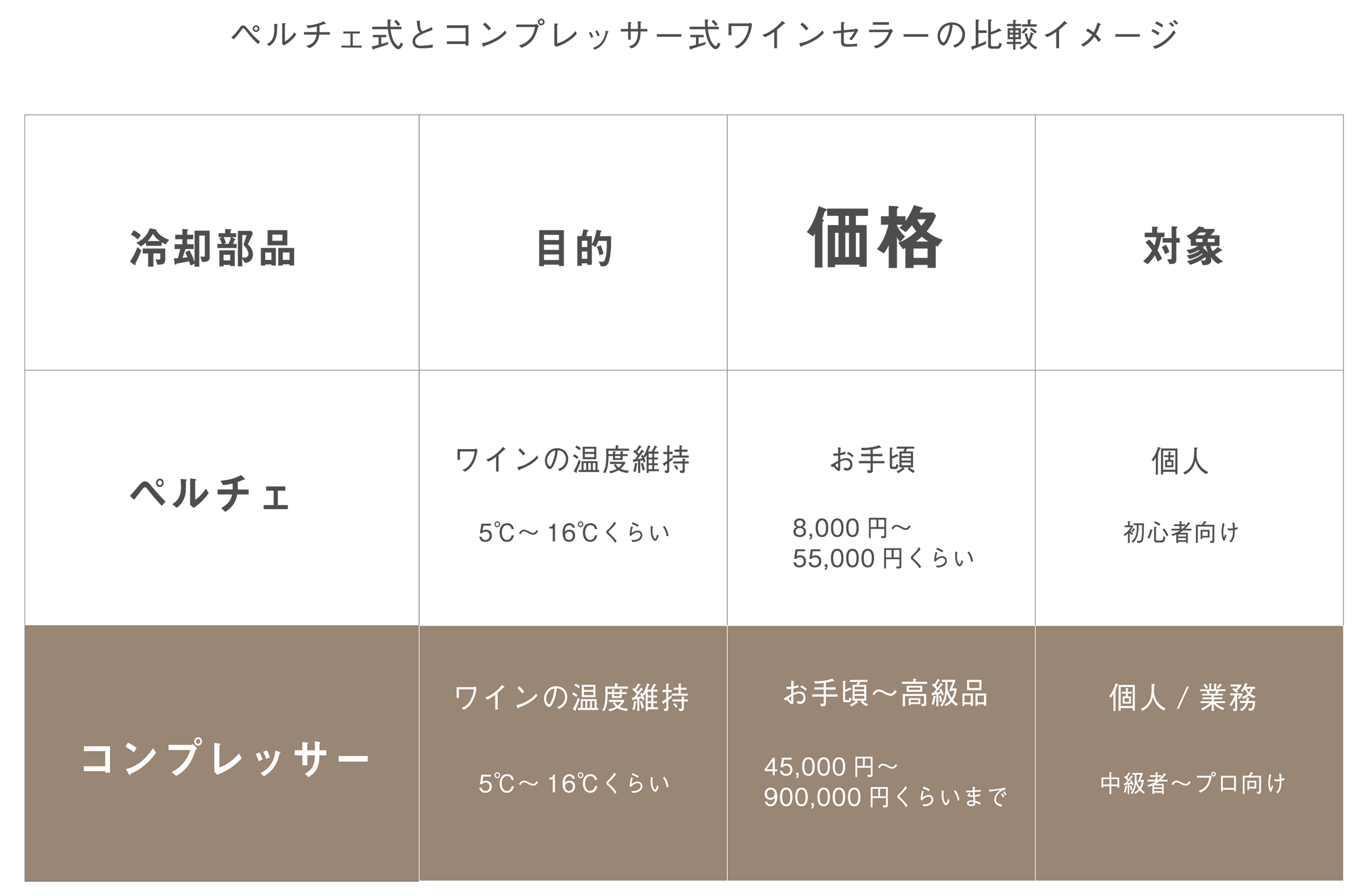 「どうしてペルチェ式はお手頃な価格なの?」という意図が隠れていて、おおよそ下記の表にまとめられます。