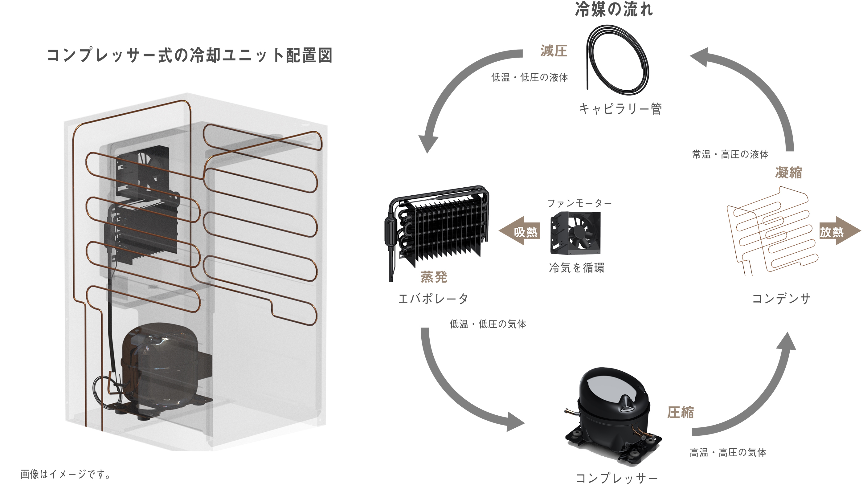 これらの部品を組み立ててみます。これを「冷却ユニット」と呼びます。ワインセラーでは製品に冷却ユニットを適正に内蔵して電気のエネルギーを加えることで冷却性能を発揮します。イラストで見るとわかるように、構造が全く違うことが見えてきます。