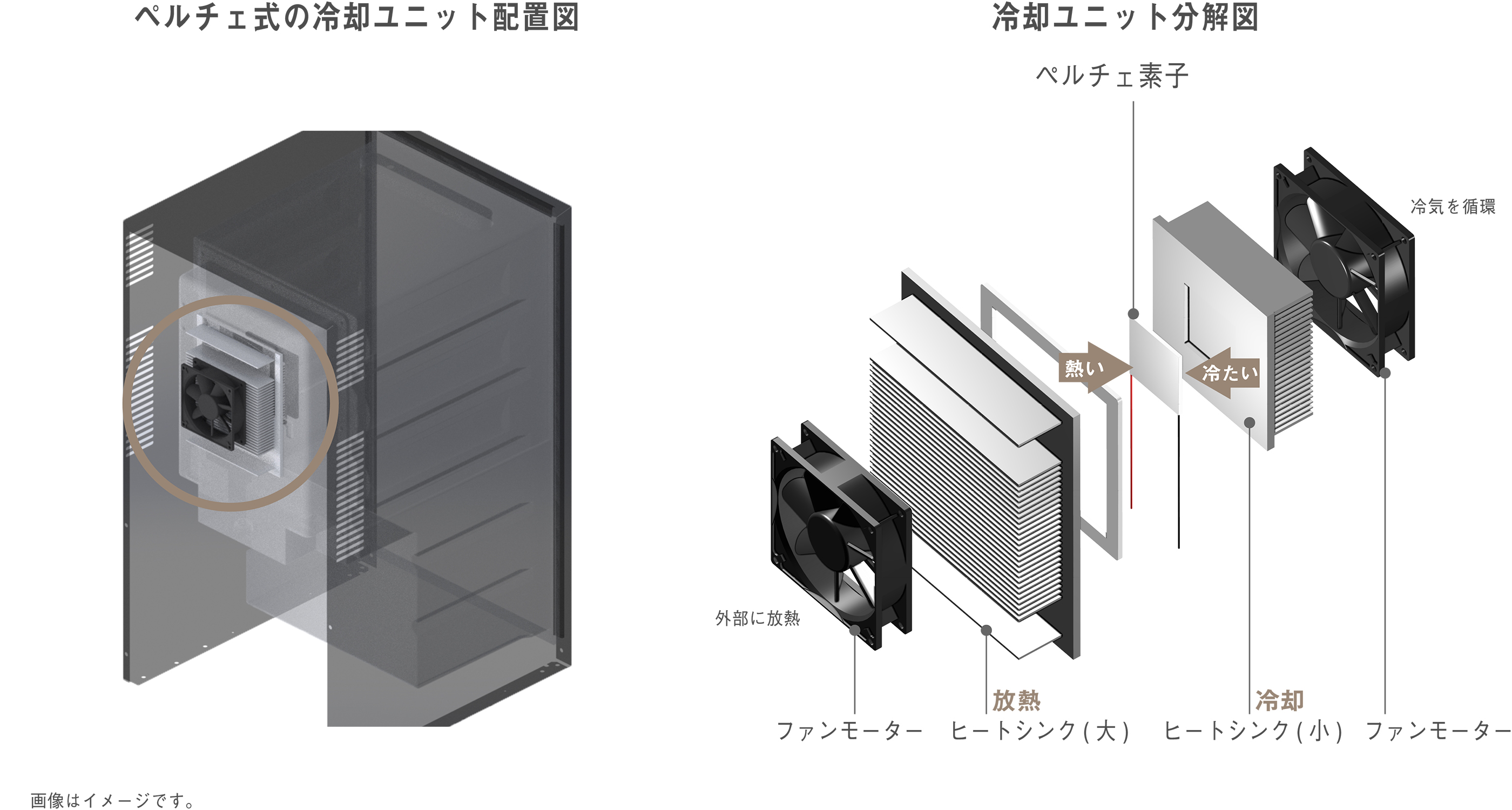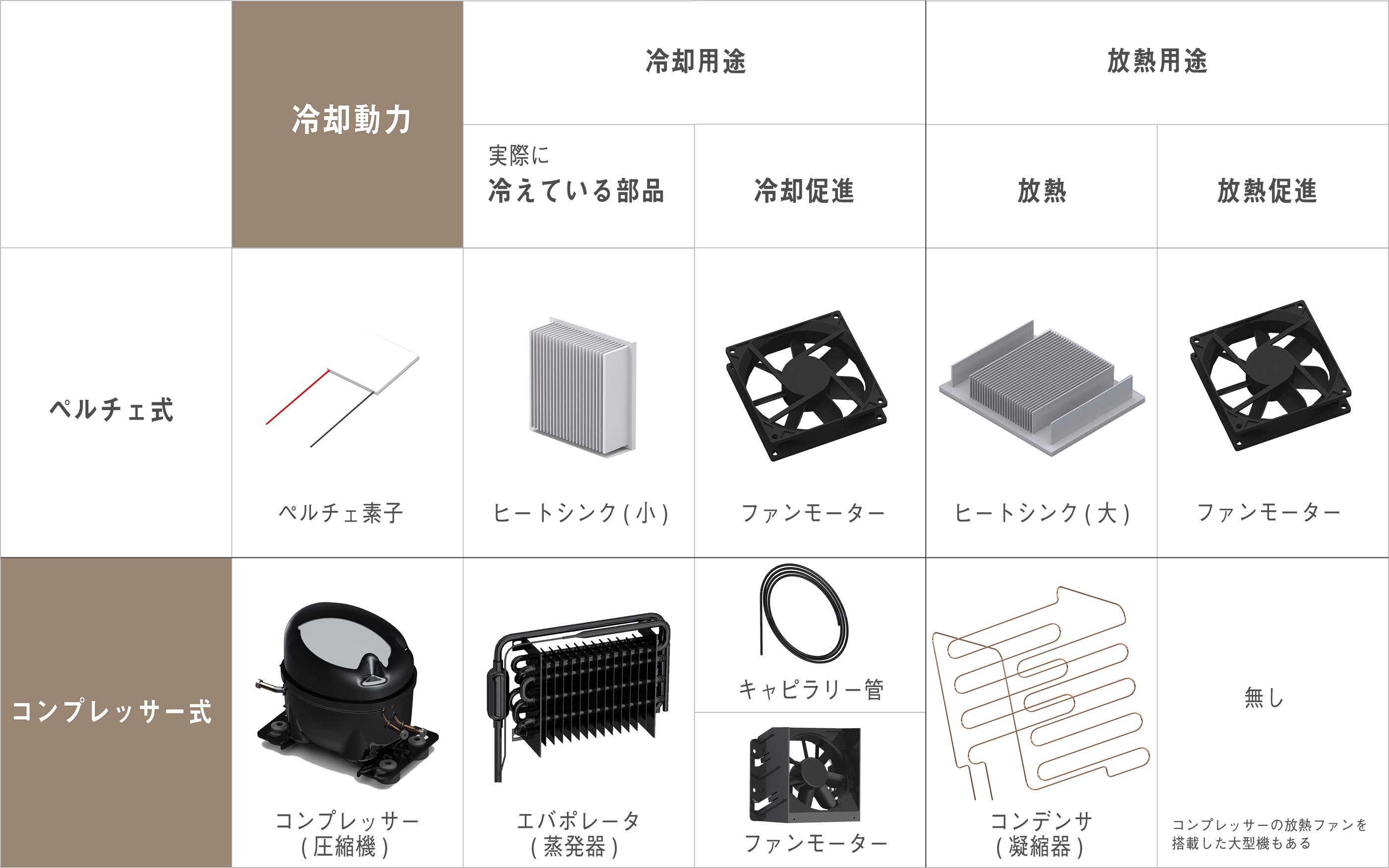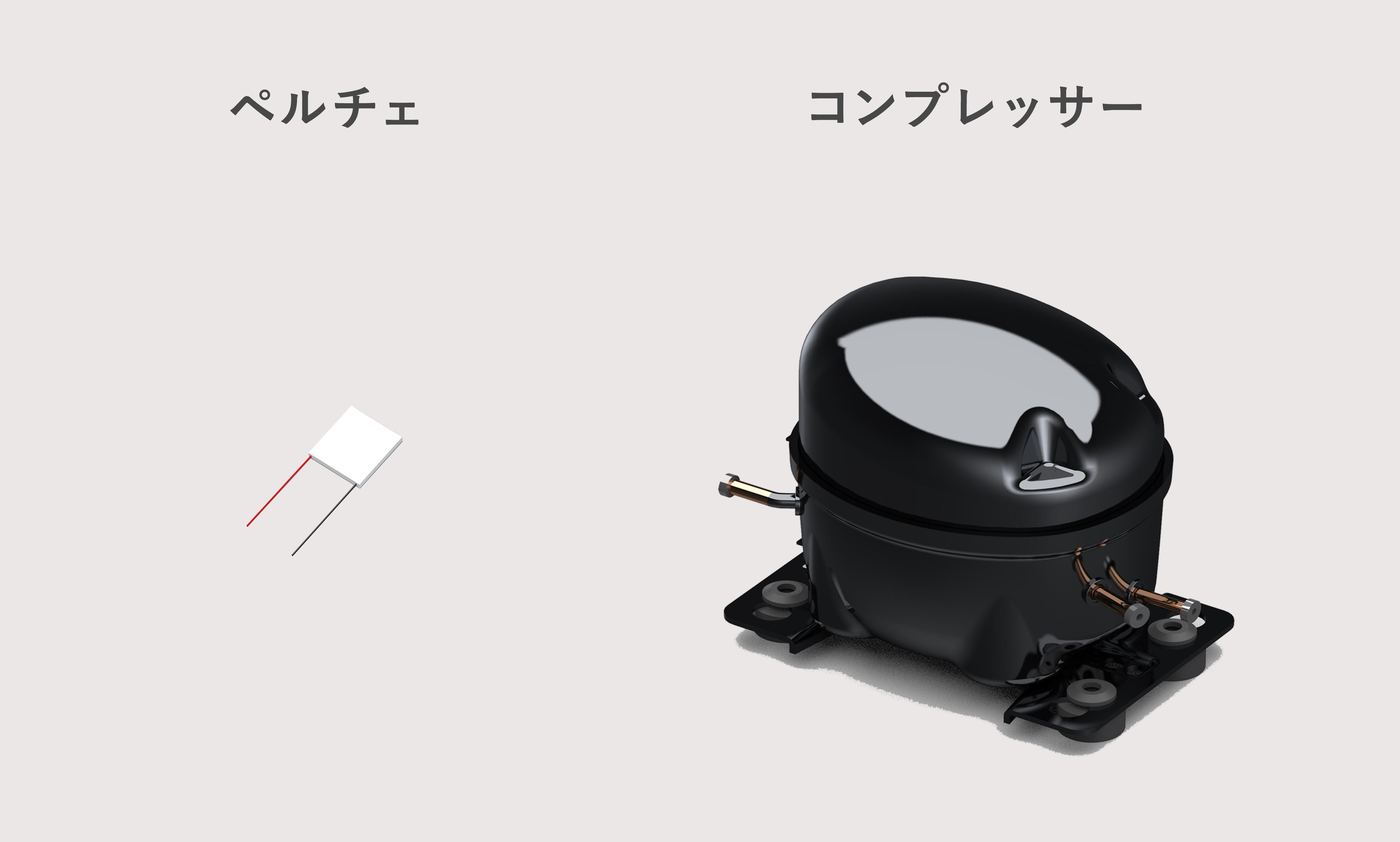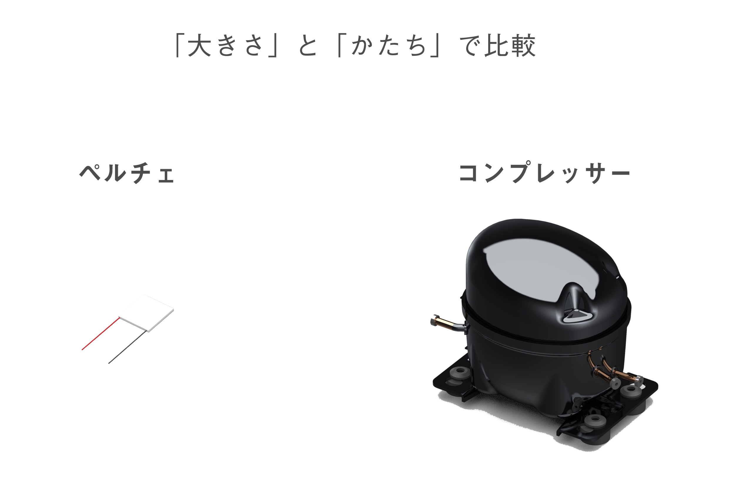以上ユーザーメリットに着眼して、ペルチェとコンプレッサーの違いを説明してきました。次は実際の部品や構造の比較です。