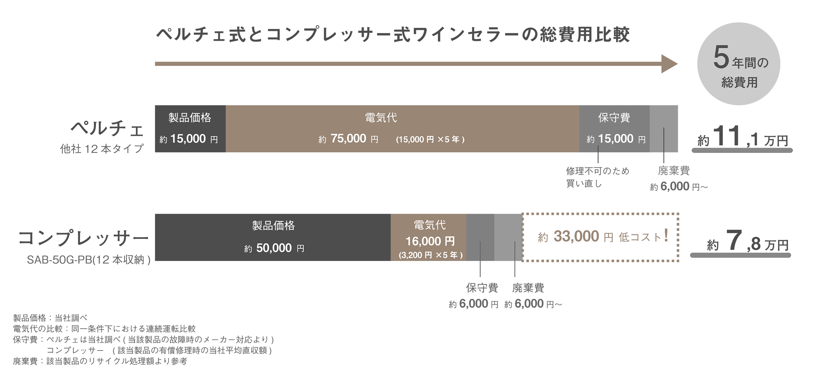 例えば、ワインの初心者用として人気のある12本収納タイプのワインセラーは、様々メーカーから発売されています。ペルチェタイプの平均的な価格は15,000円ほど。それに対して、弊社の12本収納タイプのコンプレッサー式製品は約50,000円。実に、3倍以上も高額な価格帯です。製品価格だけで比較すると、ペルチェタイプの製品はお手頃で魅力的に見えます。しかし、これだけで判断するのは禁物。ワインセラーを購入した後にかかる費用も考慮し、トータルコストで比較することをおススメします。