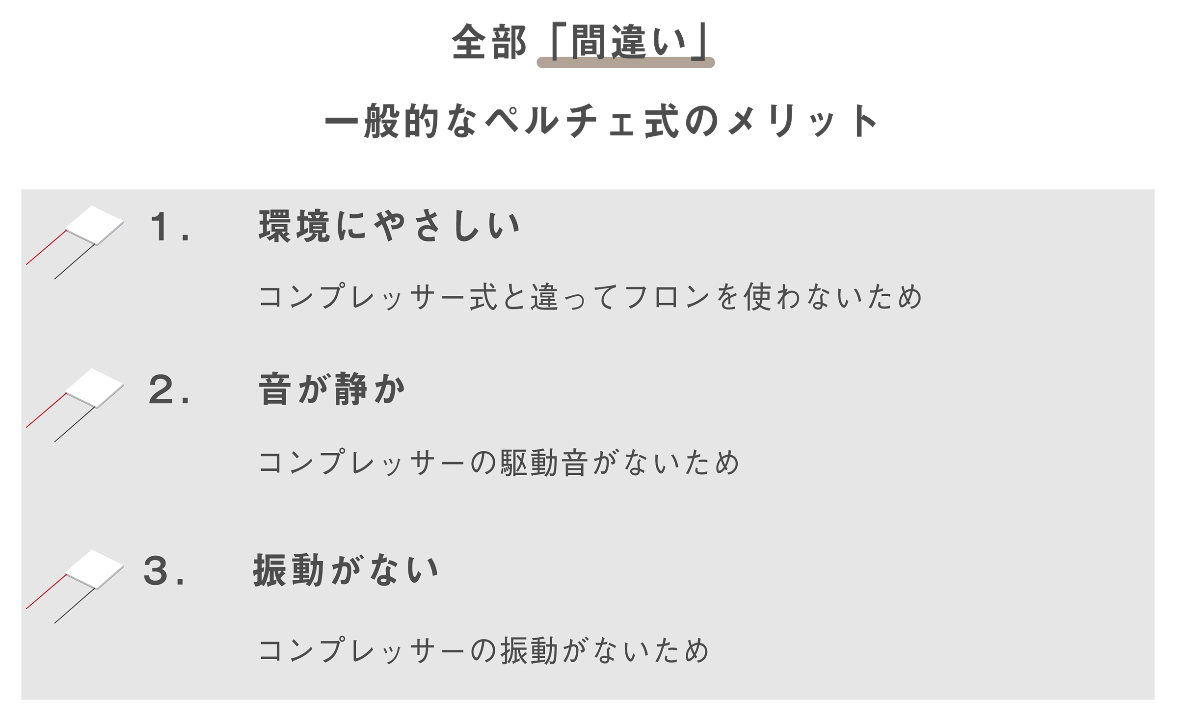 最後に、何年もの間コンプレッサーと対比させて伝えられきている「ペルチェの優位性」は、いずれも誤った情報です。これらの誤解についても解説していきます。