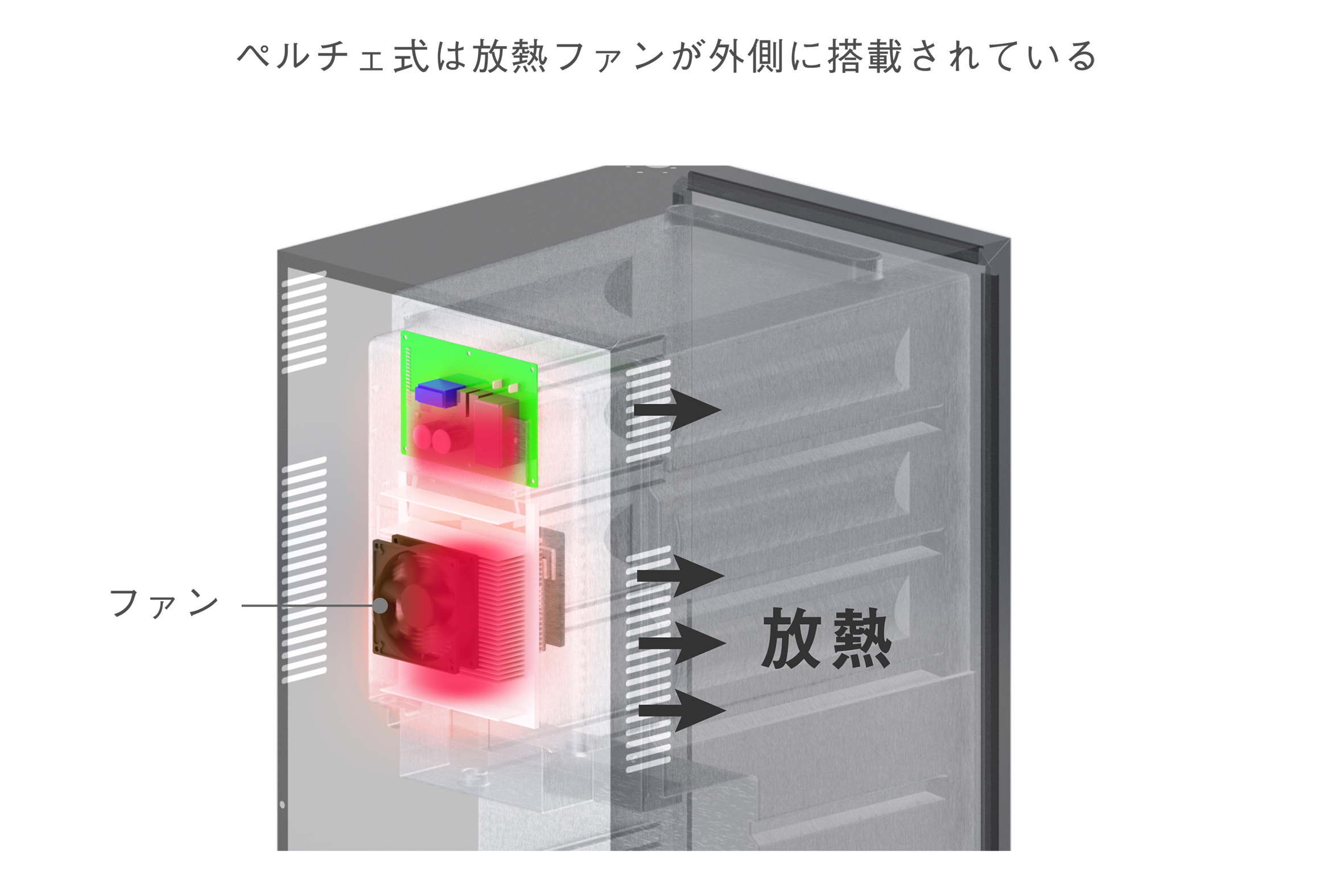 ペルチェとコンプレッサーの違いを説明する為に単純化して説明しています。本来は技術的要素が複合的に重なって性能が出ます。