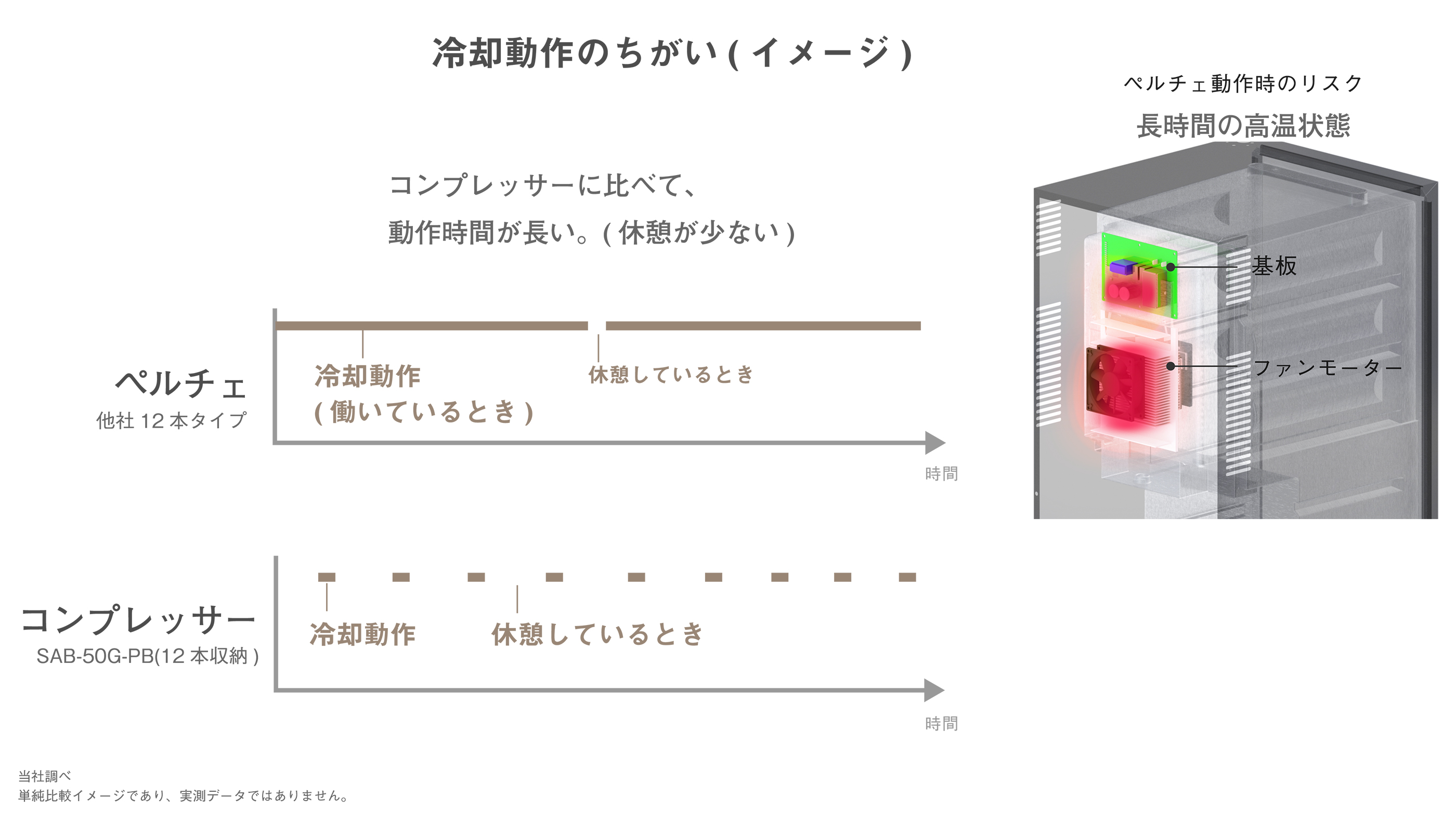 冷却パワーの差は、運転時間でリカバー。結果、ペルチェは長時間運転になりやすい