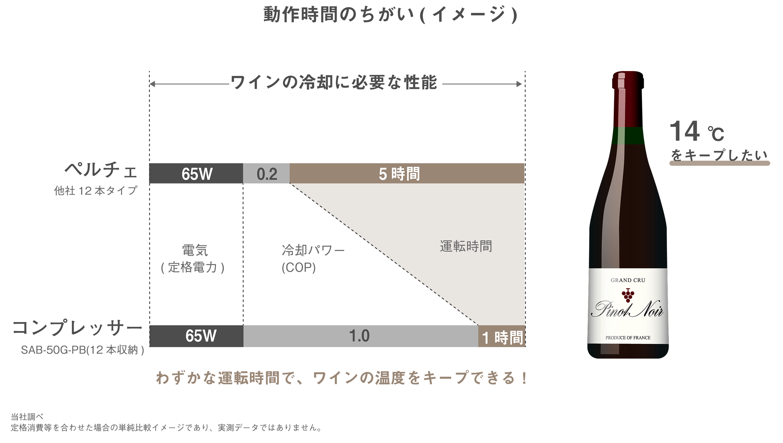 下のイラストにあるように定格電力(電気エネルギー)はどちらも同じ65Wのワインセラーがあるとします。同じ量の電気エネルギーを使っていても、ワインの冷却完了まで長い時間をかけて運転を続けていきます。