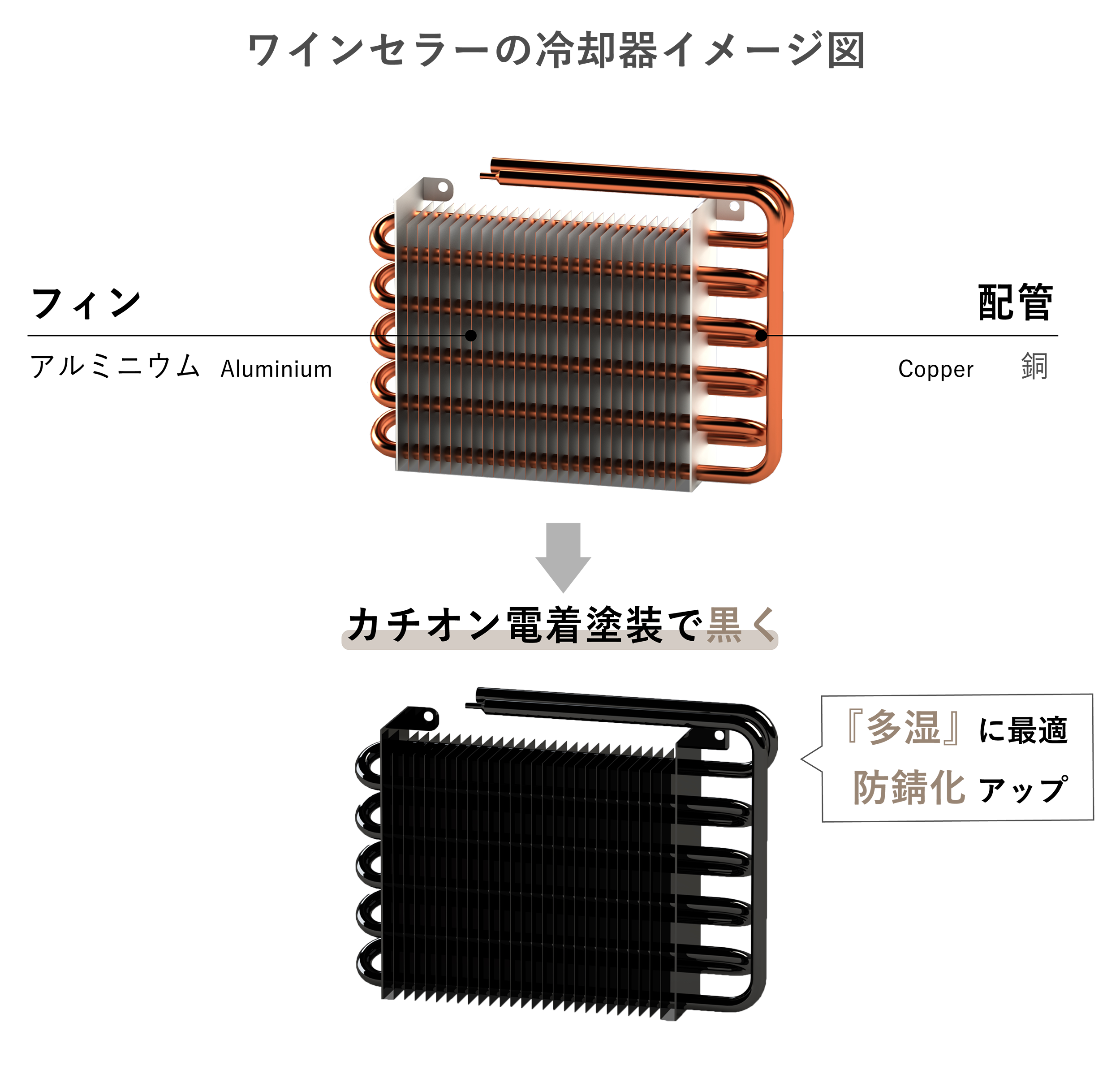「多湿」を想定した場合、具体的には冷やすための部品である「冷却器」に対して、『防錆化対策』が検討できます。ワインセラーは「10℃~18℃程度」の中域温度で使うことが多いので、水分が霜(氷)とならず常に水滴が付着した状態。ジメジメした環境での動作であるほど、冷却器に多量の水分が吸着することによる配管の腐食リスクを懸念しなければなりません。