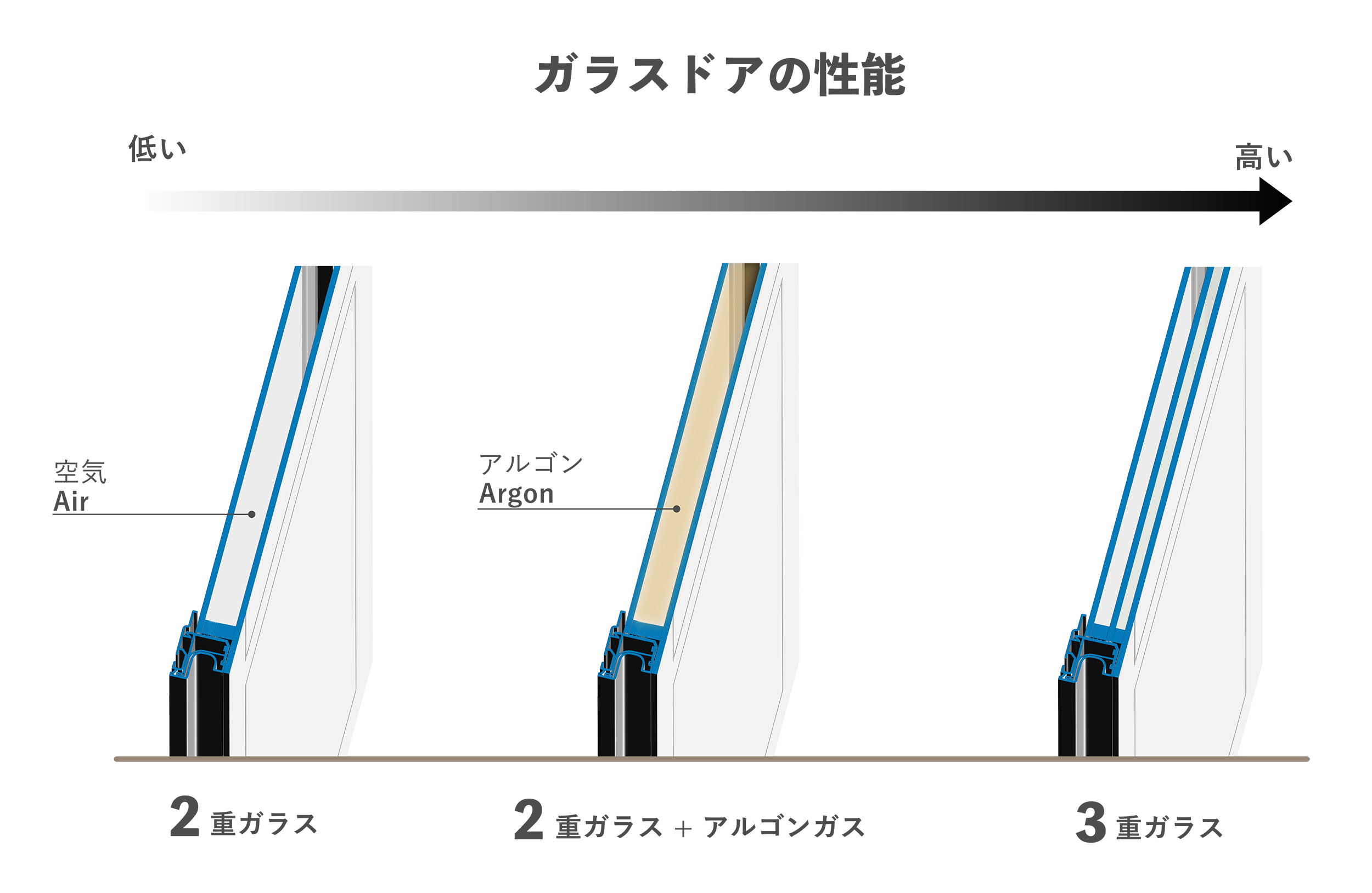 ガラスは遮熱効果を期待できない素材。3重ガラスのほか、アルゴンガスの封入やLow-E膜の貼付け、真空ガラスなどを付加して結露対策を講じます。家庭用を想定した機器であれば、省エネの点からドアヒーターで結露を抑えるのではなく、「対熱」のスペックを高めることで「結露リスクの低減」を考えたドアが望ましいと言えます。