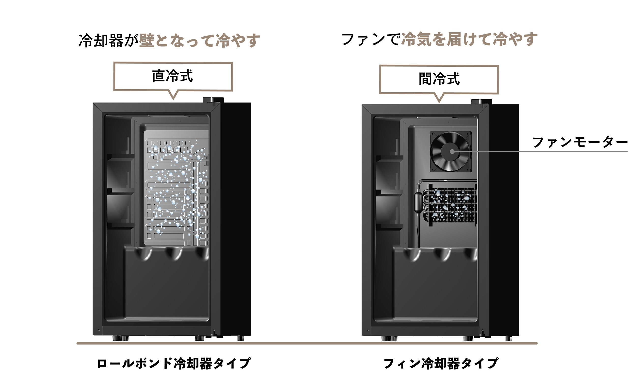 ワインセラーには2種類の「冷却器」のタイプ(詳細は後述)が使われています。冷却器のタイプによって、ファンモーターが使われていない製品(※1)があり、その違いが根本的な「冷却に対する考え方の違い」となっています。たとえば、部屋を涼しくしたいとき、エアコンを使うのと似た構造が「フィン冷却器」を使った製品。特長は、ファンモーターによって冷たい風を庫内に送り届けられることです。もう一方の、「ロールボンド」と呼ばれるタイプは、パネルエアコンのような、壁を冷たくして空間を涼しくしようとするイメージ。輻射(ふくしゃ)効果を期待して冷却するので、風を使いません。