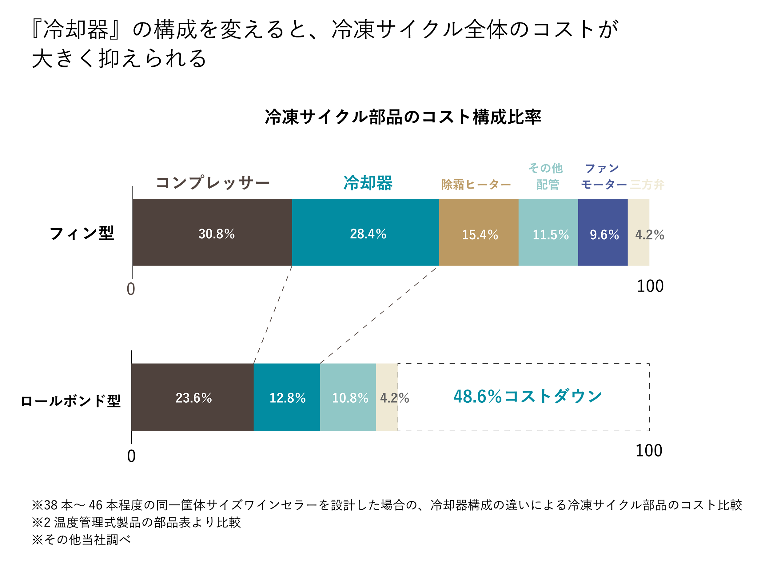 ワインセラーにおいて、配管に薄いアルミフィンを通した「フィン(間冷式)」の冷却器であった方が良いのは、冷却面積が大きく(※1)取れるので高効率であるためです。その反面、コストは上がってしまいがち。「コンプレッサー式」は同じでも、「冷却器の差による構造の違い」は一括りにはできない大きな「差」を生むことから、以下に特長をまとめています。